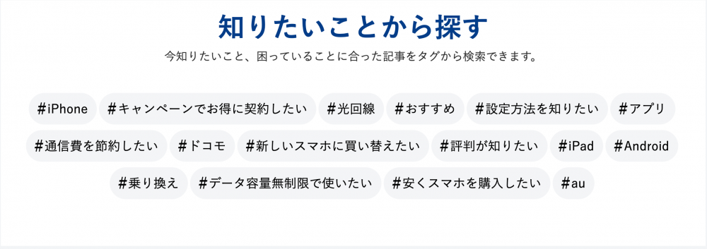 また、一番下の箇所までスクロールすると、知りたいジャンルや代表されるお悩みがタグ化されているので、そこから検索するとスムーズにお悩みを解決できますよ。