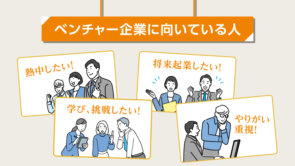 メリットでもお伝えしたように、将来起業や独立を考えている人もベンチャー企業に向いています。幅広い仕事をしながら、経営陣の近くで経営に必要な感性を養えるのはベンチャー企業だからこそできること。