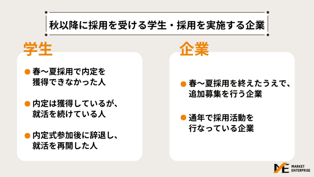 反対に、秋採用で内定獲得を目指す学生の数は春~夏採用で就活を終える学生もいることから少なくなっていそうな印象ですが、春~夏採用で内定を獲得できなかった学生だけでなく、内定を獲得しているものの就活を続けたり就活を再開した学生がおり、教員試験やその他何らかの理由で春~夏採用に参加できなかった層の学生も新たに加わります。