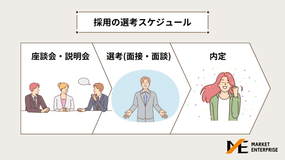 オンライン説明会や座談会の案内からスタートして、書類選考なしで面接に進みます。