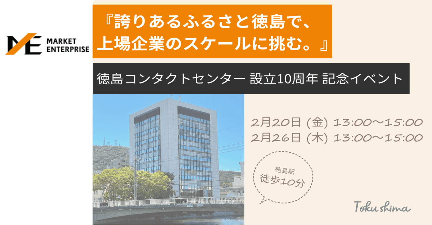 株式会社マーケットエンタープライズ(以下、ME)の徳島オフィスは、2026年に設立10周年を迎えます。『誇りあるふるさと徳島で、安定した基盤と、全国トップレベルの成長を。』そんな働き方が、弊社では実現できます。