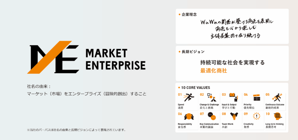 「Win Winの関係が築ける商売を展開し、商売を心から楽しむ主体者集団で在り続ける」という企業理念、そして「持続可能な社会を実現する最適化商社」という長期ビジョンのもと、MEは多角的に事業を展開してきました。
