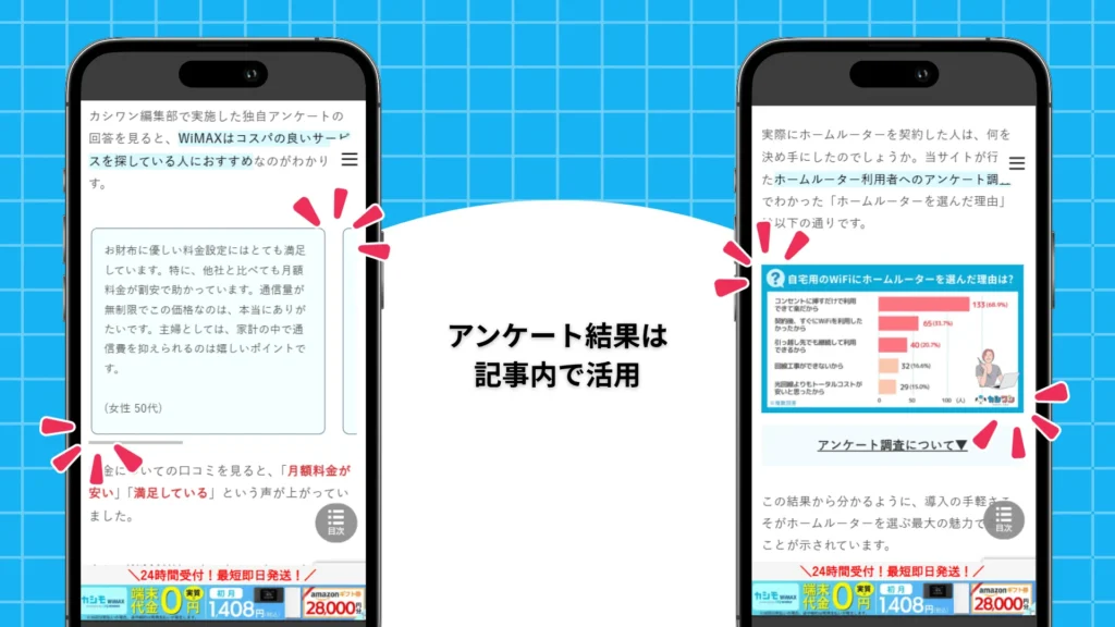 公式サイトの情報や編集部の計測値といった情報だけでは伝わりにくいサービスの「実際の満足度」や「リアルな使用感」などを明確に伝えるため、第三者機関によるアンケート結果をコンテンツに活用しています。