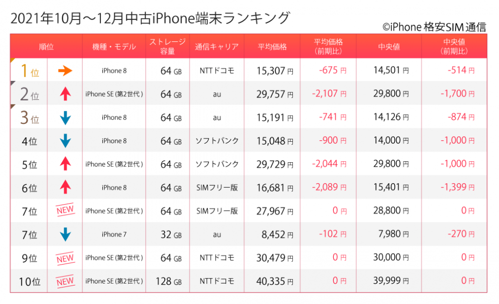 iPhone 13シリーズの発売により、買い替え需要が高まり、発売から時間が経っていたiPhone SE(第2世代)が中古市場に出てきたことで、大きな順位変動が見られました。
