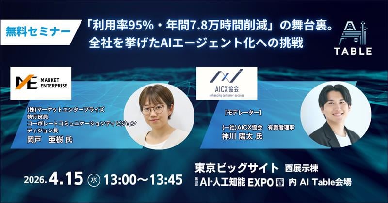 2026年4月15日に開催される「NexTech Week 2026【春】」内のセミナー「AI Table 2026(春)」に、マーケットエンタープライズ執行役員の岡戸 亜樹が登壇します。